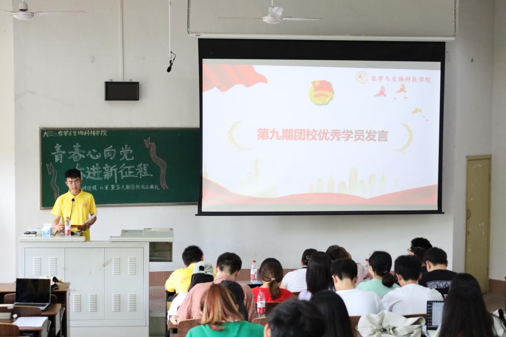 本期团校于2021年11月开班,课程内容丰富,形式多样,涵盖了新闻写作和策划能力培训,团学骨干核心素养提升,创新创业知识讲座,奥运精神、红色精神等诸多方面。学员们认真学习、收获良多,沈益冰等共15名同学被评为“优秀学员”。来自2021级植物生产类三班的李济聪同学作为“优秀学员”代表上台发言,表示经过团董事长期丰富的培训学习,自己受益匪浅,不仅思想上得到了提高,心理上更获得了充实与满足,接下来将继续不忘初心,牢记使命,为共产主义事业不懈奋斗,为青春谱写无悔的赞歌