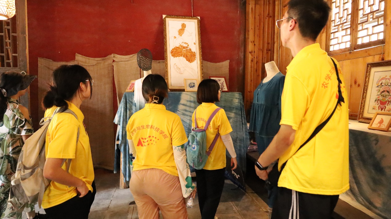 24把飞刀刀柄呈楼梯状旋转着插入一根杉木柱中,伫立在实践队面前的是苗族传统风习——苗家上刀梯。每逢重要节日,苗家都会开一场刀梯会,此时男女老少身着节日盛装,佩戴金银首饰,气宇轩昂,从四面八方涌去上刀梯的空地。现在苗家上刀梯多为对美好事业的执着追求和对幸福生活的向往。对于苗家独特的扎染技术,实践队王秋予感叹,每一块扎染的布料都好精巧,这是苗族人民的智慧。