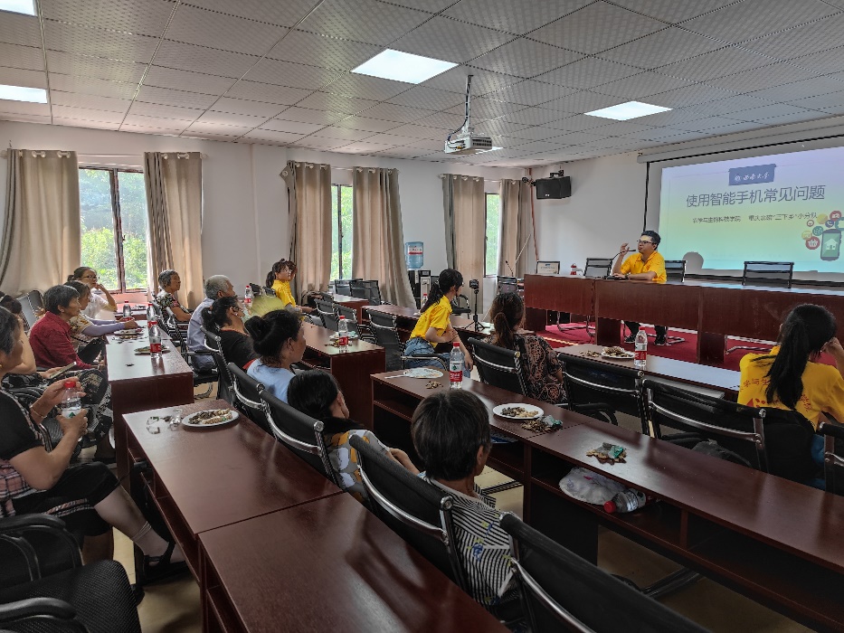 本次系列讲座的最后一部分便是针对这种情况的智能手机使用问题答疑。面对宣讲开始前的小调查,来参加的村民们大多表示自己有智能手机,但经常使用的占少数,很多村民都因用不熟练而将智能手机闲置。本环节由有小米手机直营店丰富实习经验的队员主讲,他讲自己在实习过程中遇到的七个老年人常见手机使用问题逐一进行解释。活动现场气氛热烈,互动良好。队员在台上娓娓道来,详细讲解,村民们边听边点头。他们表示,以前搞不懂的很多东西都被解答得很清楚,发现以前的很多问题都不是问题。