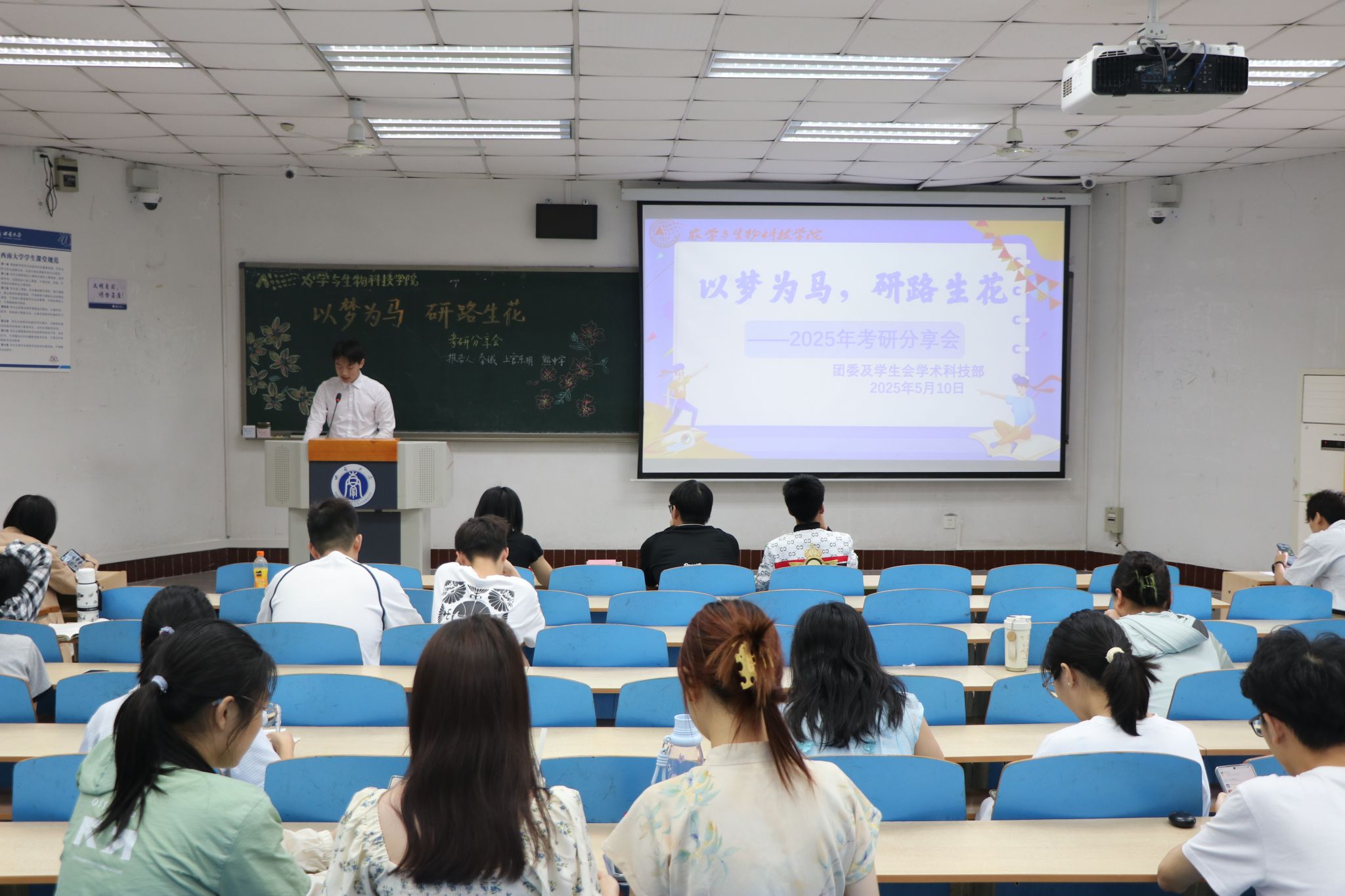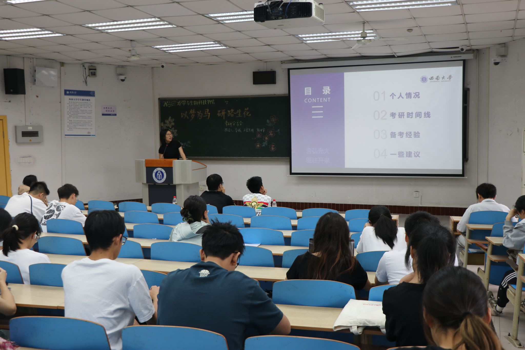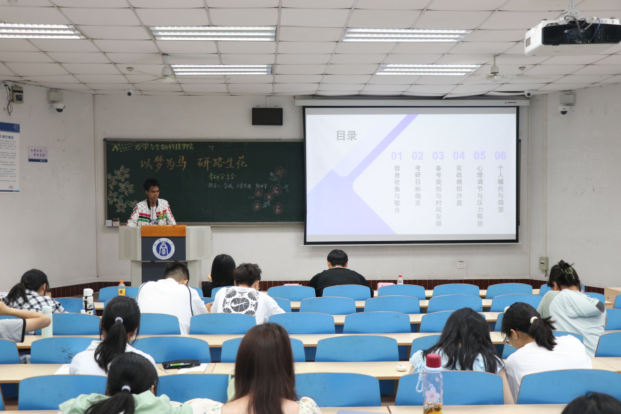 成功考研至本校作物遗传育种专业的熊中宇同学向同学们介绍了他的“三阶段备考法”:3—6月筑基期,要注重教材精读与真题初探;7—9月强化期,要实施“专业课+公共课交叉复习”的战略,不断提升学习效率;10—12月冲刺期,可以通过模考训练,进一步优化答题节奏。此外,他建议同学们通过研招网、高校官网等权威渠道获取数据,并自制动态表格进行信息整合。针对政治复习,熊中宇同学还向同学们介绍了“思维导图+时政热点”的学习方法。分享尾声,他以“每一次挫败都是心灵的淬火”的励志寄语,鼓励大家以坚韧心态直面备考挑战。