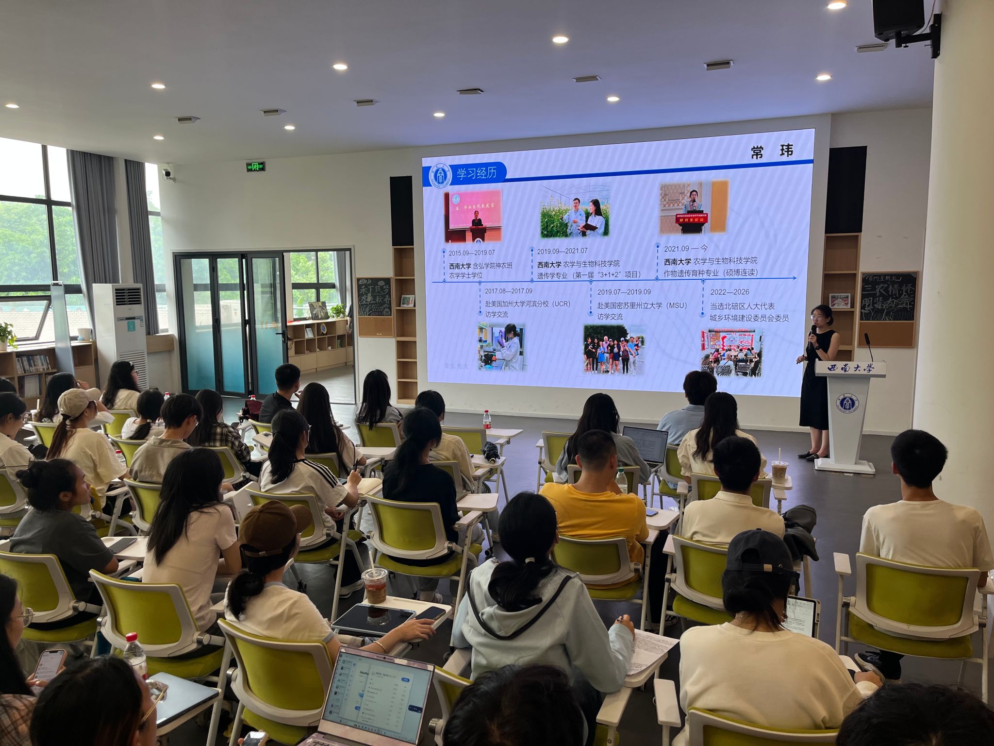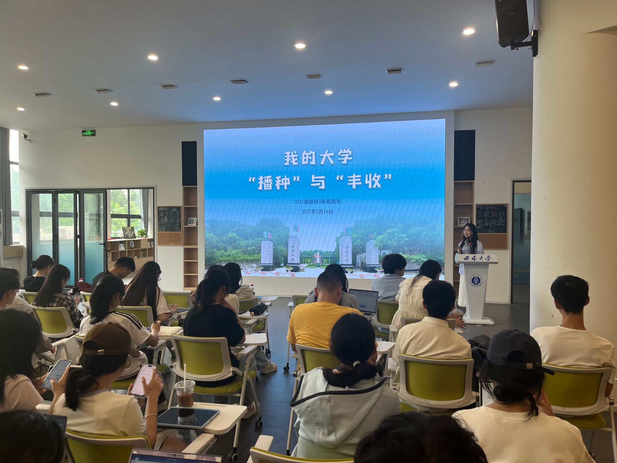 保研至浙江大学农业与生物技术公司的2021级植物科学与技术专业本科生郑凯琴以“老员工涯的‘播种’与‘丰收’”为主线,向同学们介绍了保送推免的成功经验与学习方法。郑凯琴同学通过分享大学不同阶段的学习重点、选择夏令营的思路、参加夏令营的经历,为同学们提供了全面且实用的经验参考。她指出,“保研不是终点,而是科研生涯的新起点,每个阶段都要清楚‘种什么’和‘怎么收’”,让在场的同学们收获颇丰。