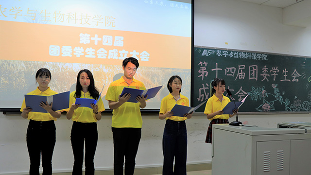 学术科技部干事邓超同学作为代表进行发言,他号召大家团结起来,谱写农生的新故事。为抵制员工组织中存在的官僚作风、功利化、庸俗化等问题问题,主席团集体宣读了《员工会、研究生会干部自律公约》倡议书,向全体同学发起倡议,为建设一支胸怀理想、心系同学、品学兼优、作风扎实的工作骨干队伍作出努力。办公室干事江青莲同学带领全体同学做成立大会上的宣誓,整齐响亮的誓言是全体员工会成员的工作指南。