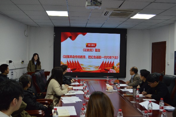 活动中,教师第二党支部书记杜海和本科植科党支部书记高荣蓉分别介绍了两支部情况。教师第二党支部党员周永洪带领全体党员学习了习近平总书记在中共中央政治局第十七次集体学习时的重要讲话精神。他从文化强国战略目标的提出背景、内涵及其重要意义、发展新时代中国特色社会主义文化的主要路径三方面进行了系统的阐述。植科本科党支部党员陈嘉琪带领全体党员学习了习近平总书记给中国国际老员工创新大赛参赛员工代表的回信和《论教育》篇目中《加强革命传统教育,把红色基因一代代传下去》,并分享道:我们当代青年应当紧跟党的步伐,切实加强自我教育,为党和人民事业拼搏奉献,主动担当作为、积极奉献,在新时代新征程上留下无悔的奋斗足迹。