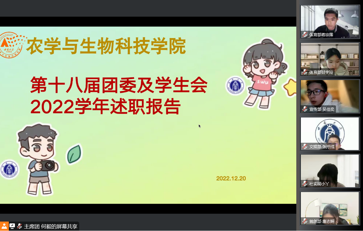 为深入贯彻学习习近平新时代中国特色社会主义思想和党的二十大精神,落实共青团中央、教育部、全国学联联合下发的《关于推动高校员工会(研究生会)深化改革的若干建议》文件要求,不断提高公司员工会成员的综合素质,总结工作经验,12月30日晚7时,太阳成集团tyc234cc以腾讯会议形式于线上举行第十八届团委及员工会2022-2023学年秋季学期述职报告会。公司团委书记许莹竹老师出席会议,团委及员工会主席团成员、各部门负责人参会,会议由团委及员工会主席团成员何毅、段雨澄主持。各部门负责人代表制作ppt,利用图画、数据、文字等方式对本学期的部门工作进展和成效进行汇报,并对工作开展过程出现的问题进行总结反思。