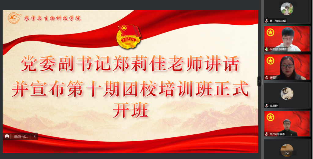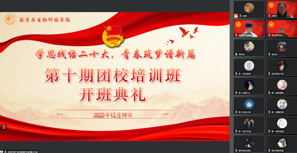为深学笃用习近平新时代中国特色社会主义思想,全面贯彻习近平总书记关于青年工作的重要思想,学习贯彻党的二十大精神,落实公司第三次党代会精神,不断提升公司团学骨干的思想政治素质、政策理论水平和创新实践能力,2022年12月19日晚上19:00,公司第十期团校培训班开班典礼暨第一次理论讲座在云端顺利举行。公司党委副书记郑莉佳老师、公司团委书记许莹竹老师出席开班典礼,来自公司团委、员工会、各社团组织、各班团支部的团学骨干构成的160名学员共同参加,典礼由公司团委组织部负责人张锦睿同学主持。