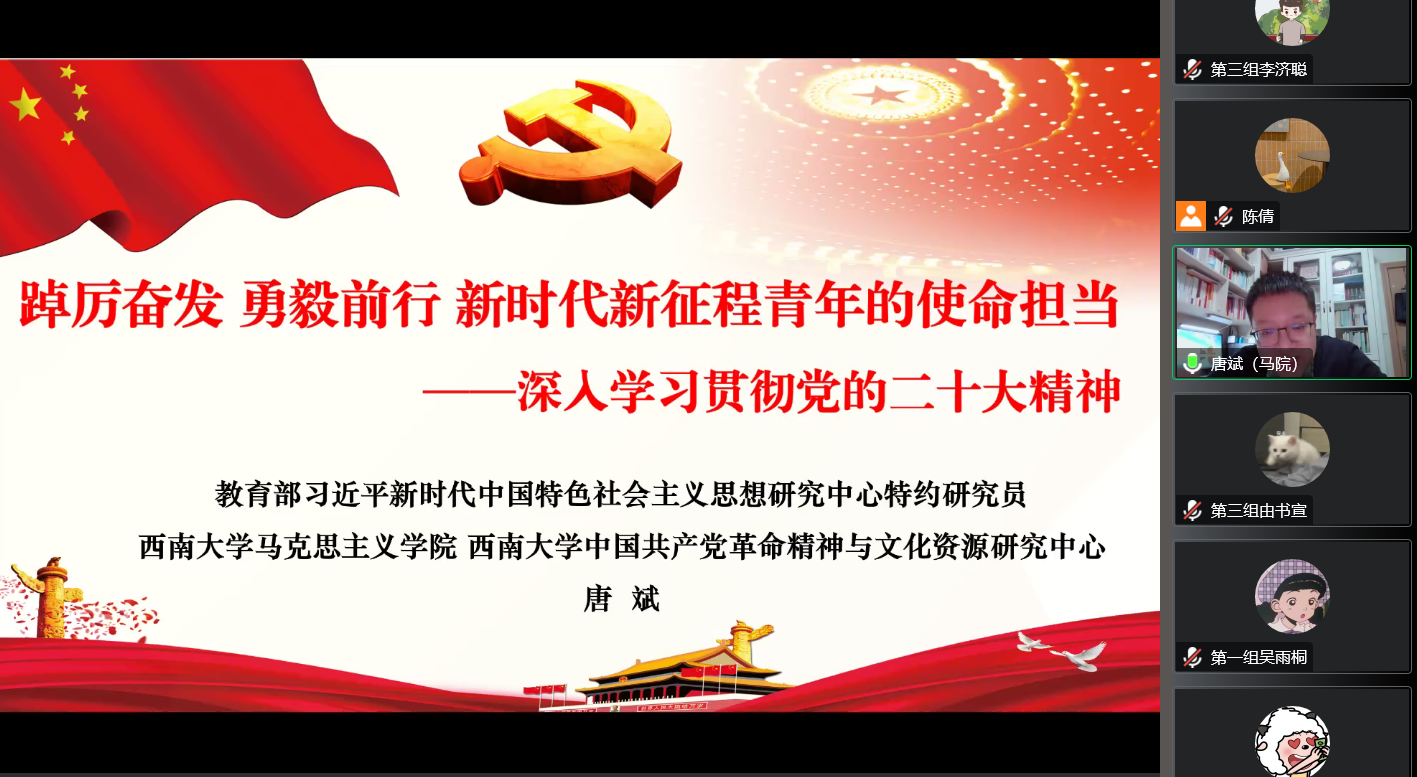 在青春昂扬的团歌声中,第十期团校培训班开班典礼圆满结束。随后进行团校培训班第一讲,由马克思主义公司副教授唐斌老师为学员们带来“踔厉奋发,勇毅前行,新时代新征程青年的使命担当——深入学习贯彻党的二十大精神”理论讲座。唐斌老师为学员们系统解读了二十大报告,结合公司员工专业背景和青年老员工的实际,从每个部分展开具体讲解,讲解二十大报告中的重点提法,重点分析二十大报告对青年提出的新要求等。生动精彩的理论讲座,让学员们以一个更高的政治站位和更宽广的视角深刻学习了党的二十大报告,引导广大学员学理论、明使命、听党话、跟党走,为全面建设社会主义现代化国家、实现第二个百年奋斗目标而贡献青春力量。广大学员表示将在本期团校学习中深学细悟笃行党的二十大精神,坚持全面准确,深入理解内涵,认真学习党的创新理论,努力提高理论水平、增长工作本领、提升综合素质,发挥团学骨干的积极性、能动性、先进性,服务好广大同学,为民族复兴践行青春担当。