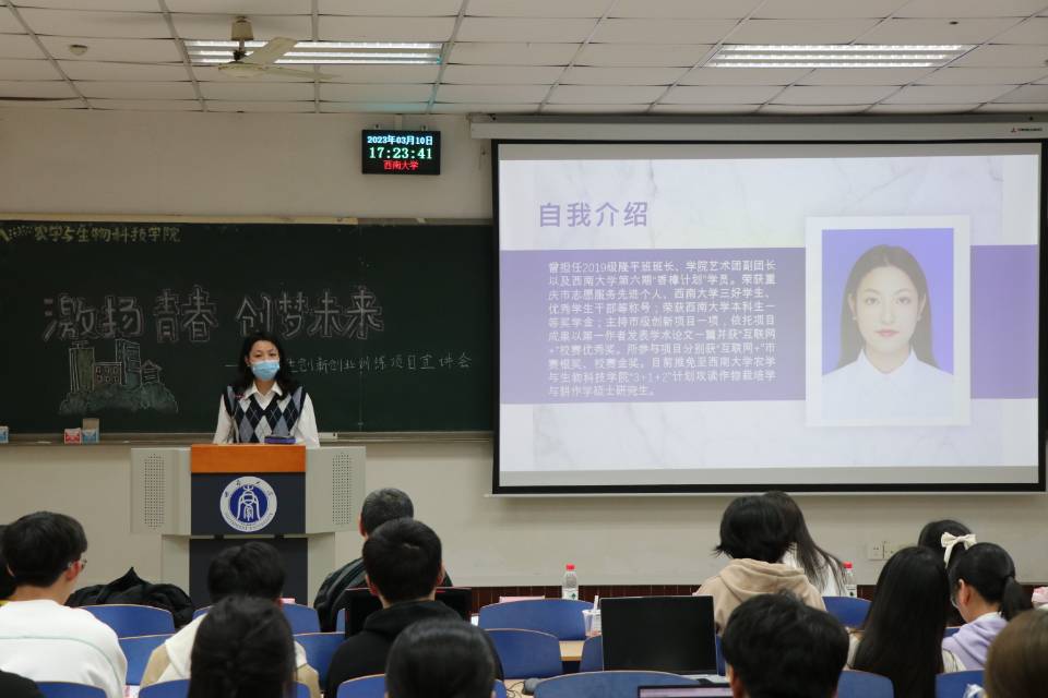 推免至公司作物栽培学与耕作学继续攻读硕士研究生的2019级隆平实验班阳新月同学就自己参加大创项目的感受与收获与同学们交流分享。她向在座同学提出两个问题并希望大家认真思考清楚,一是问自己为什么要做大创项目,二是自己想从参与大创项目的过程中获得什么。她提醒大家,做大创需要注重过程,要看到这段经历让自己哪方面得到提升,而不应只关注结果。“做大创应降低期待,全力以赴;应专注自身,重在过程,沉淀自己;应分清主次,课程任务优先,不要因小失大。”