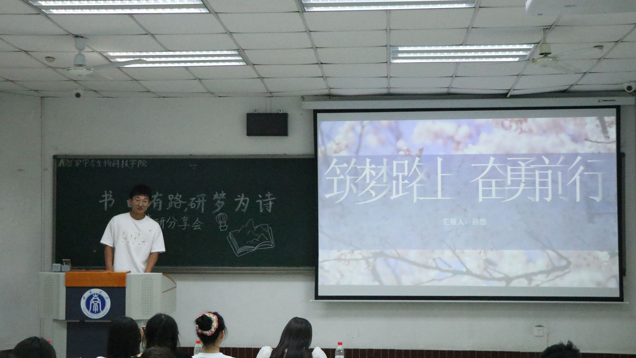 最后带来分享的是已成功考研至南方科技老员工物与医药专业的孙悠同学,他主要向大家讲述在调剂和复试过程中的体会。“遇到调剂不要担心,要鼓起勇气通过邮件等方式联系老师,通常情况下,都会收到老师的回复。”他还提到,在面试中自己的科研经历以及获奖证书给老师留下了深刻印象,他用亲身经历告诉同学们科研成果在考研复试过程中的重要性。最后,他寄语同学们,每一滴汗水都是向着光明未来迈进的见证,每一次挫败后的站起都让自己的心灵更加坚强。