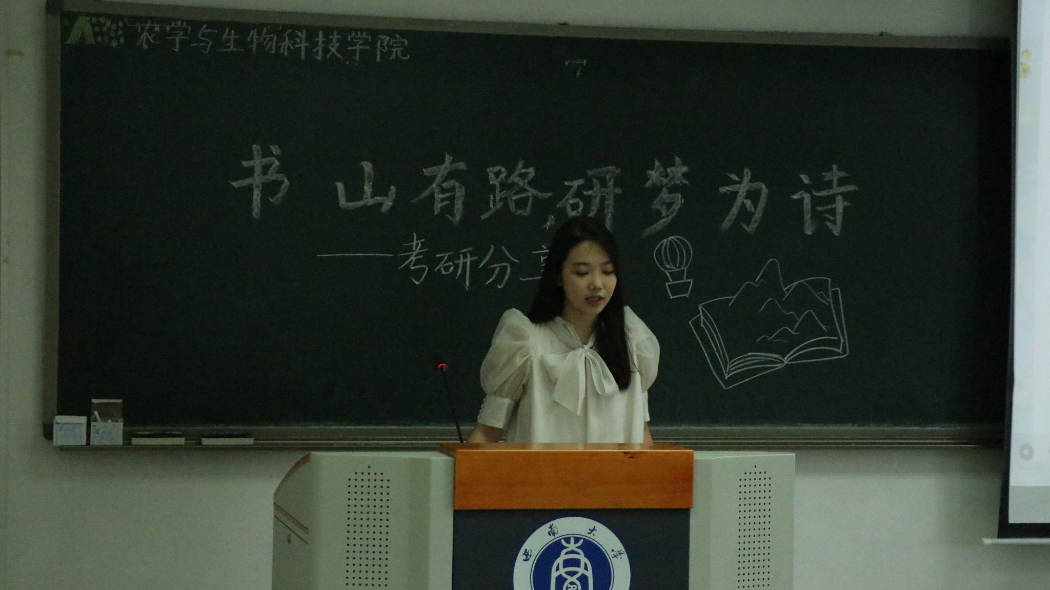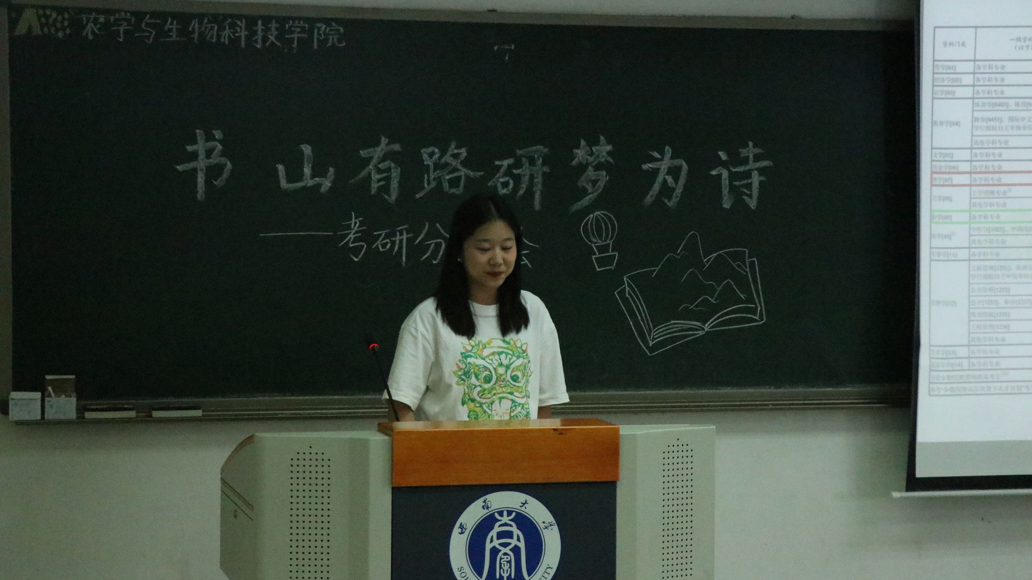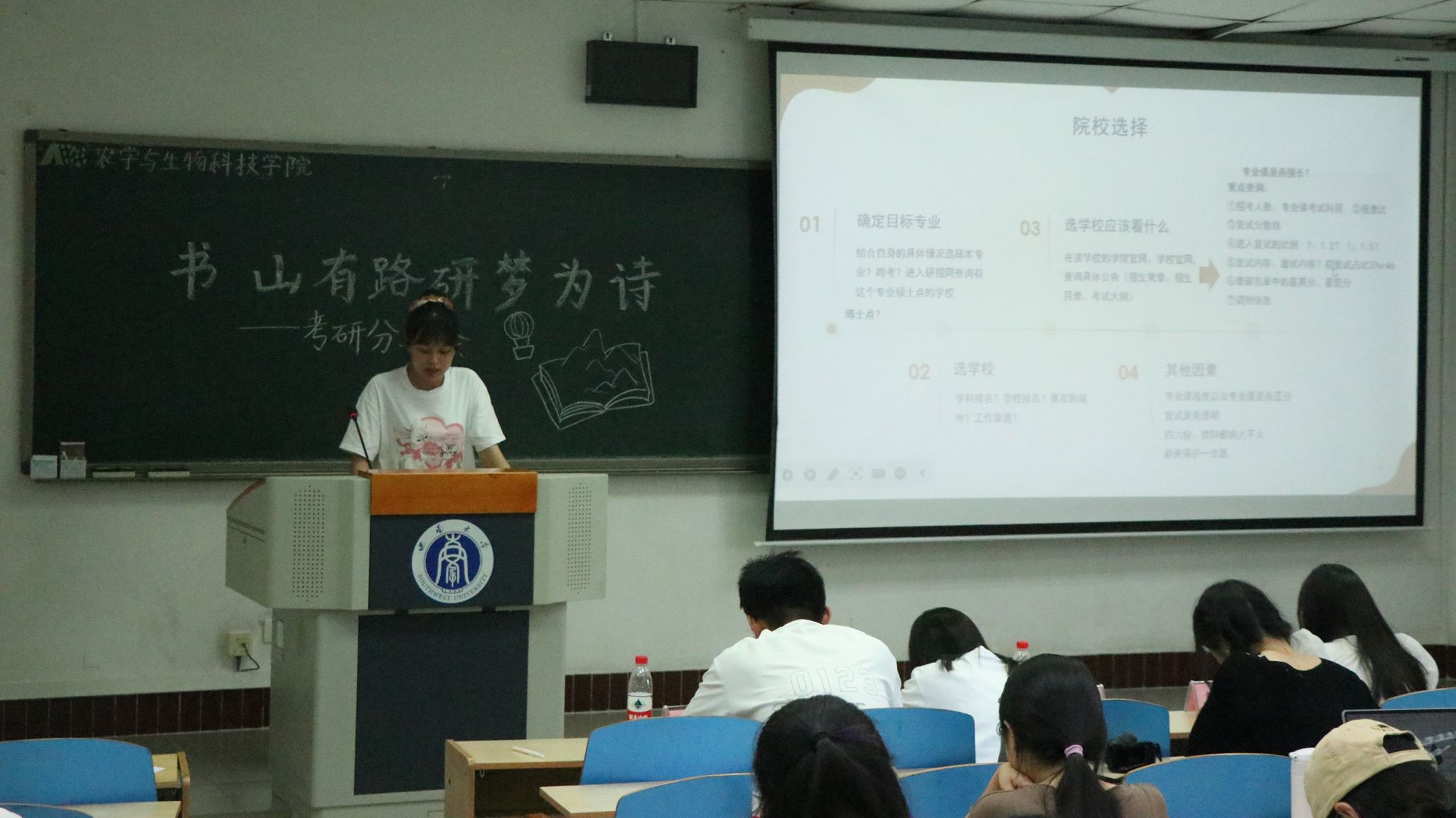 第二位是来自植物科学与技术专业的贾欣瑶同学,现已考研至西北工业老员工命公司生物技术与工程专业。她着重向同学们介绍自己备考时的学习经验,并向大家分自己使用A4纸背诵英文单词、循环记忆等高效学习方法。她指出,自主绘制思维导图能够帮助理解复杂的概念并且掌握知识之间的逻辑。同时,她还提到平时可以适当使用社交平台获取信息,但不要过度迷恋。答疑环节,她建议同学们在图书馆或自习室进行复习,可以提高学习效率。