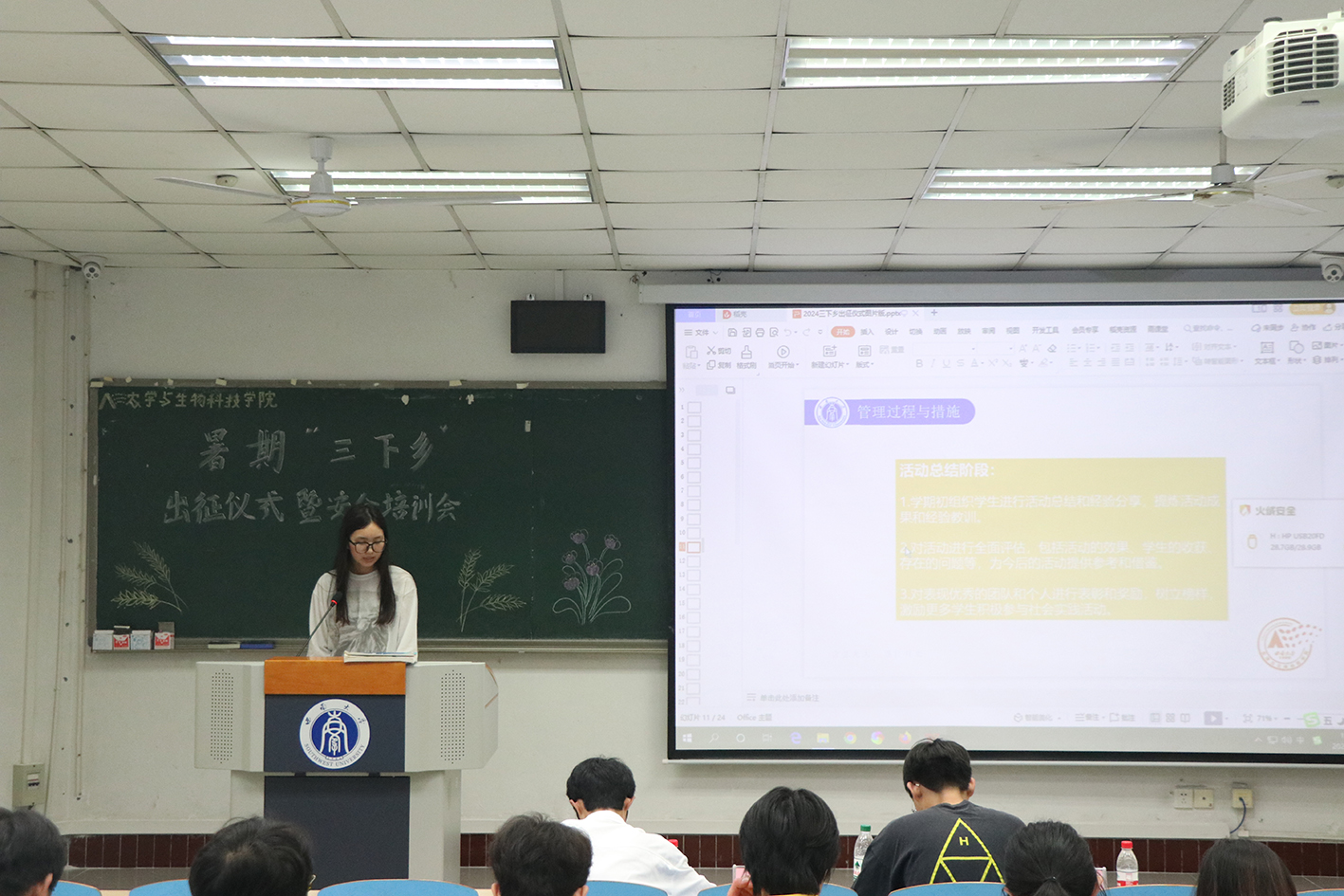 许莹竹老师首先做动员讲话,她指出老员工社会实践的重要意义,是要用脚步丈量大地,在实践中增长才干。她要求同学们一是要牢固树立安全意识,自觉树立良好形象,二是扎实开展服务,传承弘扬实践精神,三是聚焦专业背景,助力乡村振兴战略,四是不断完善自我,自觉主动锻炼成长。特别强调要切实落实安全措施,充分完善应急预案,在保障自身安全的前提下完成好实践任务。